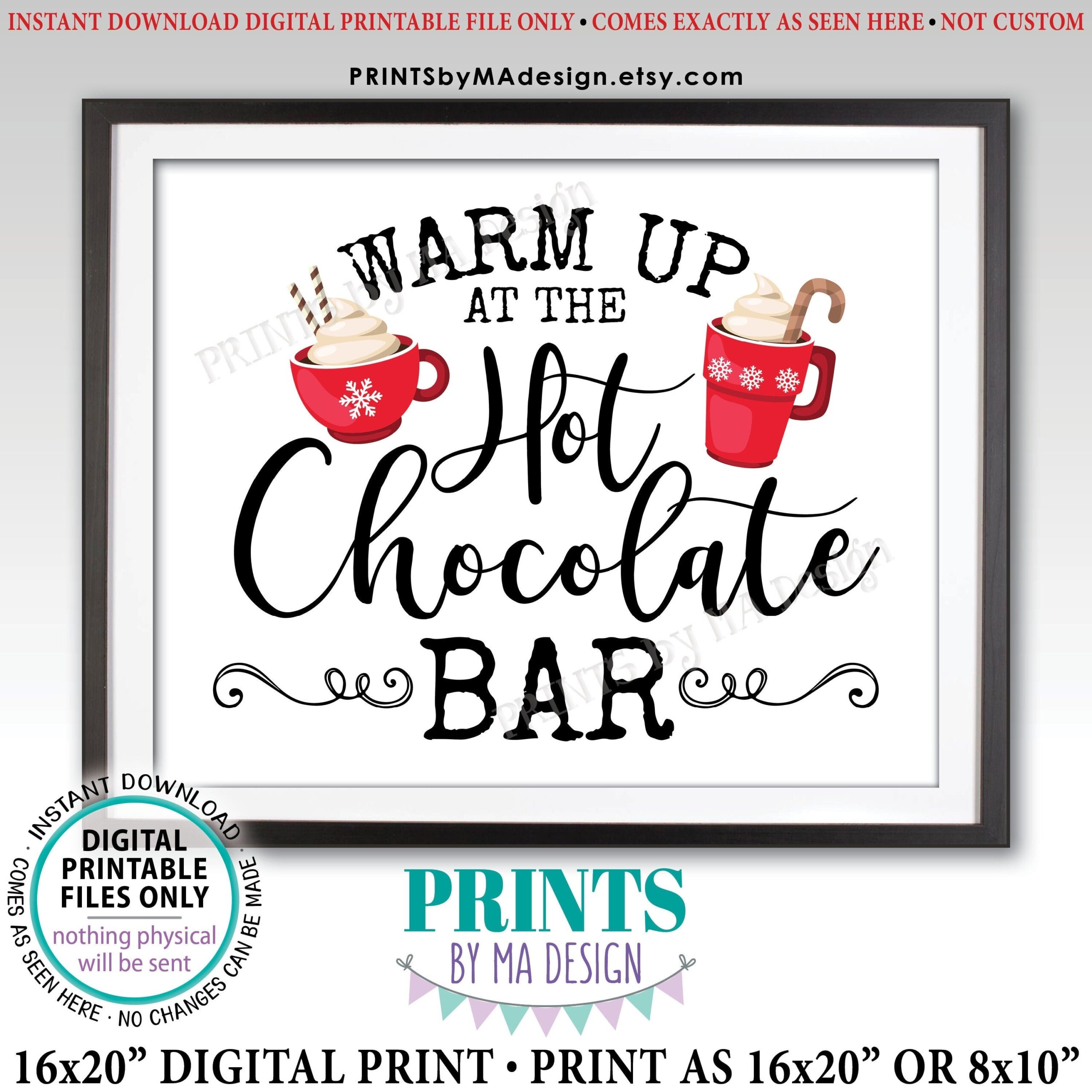 Warm Up At The Hot Chocolate Bar Sign Holiday Party Hot Cocoa Red Mugs Snowflakes PRINTABLE 8×10 16×20 Sign