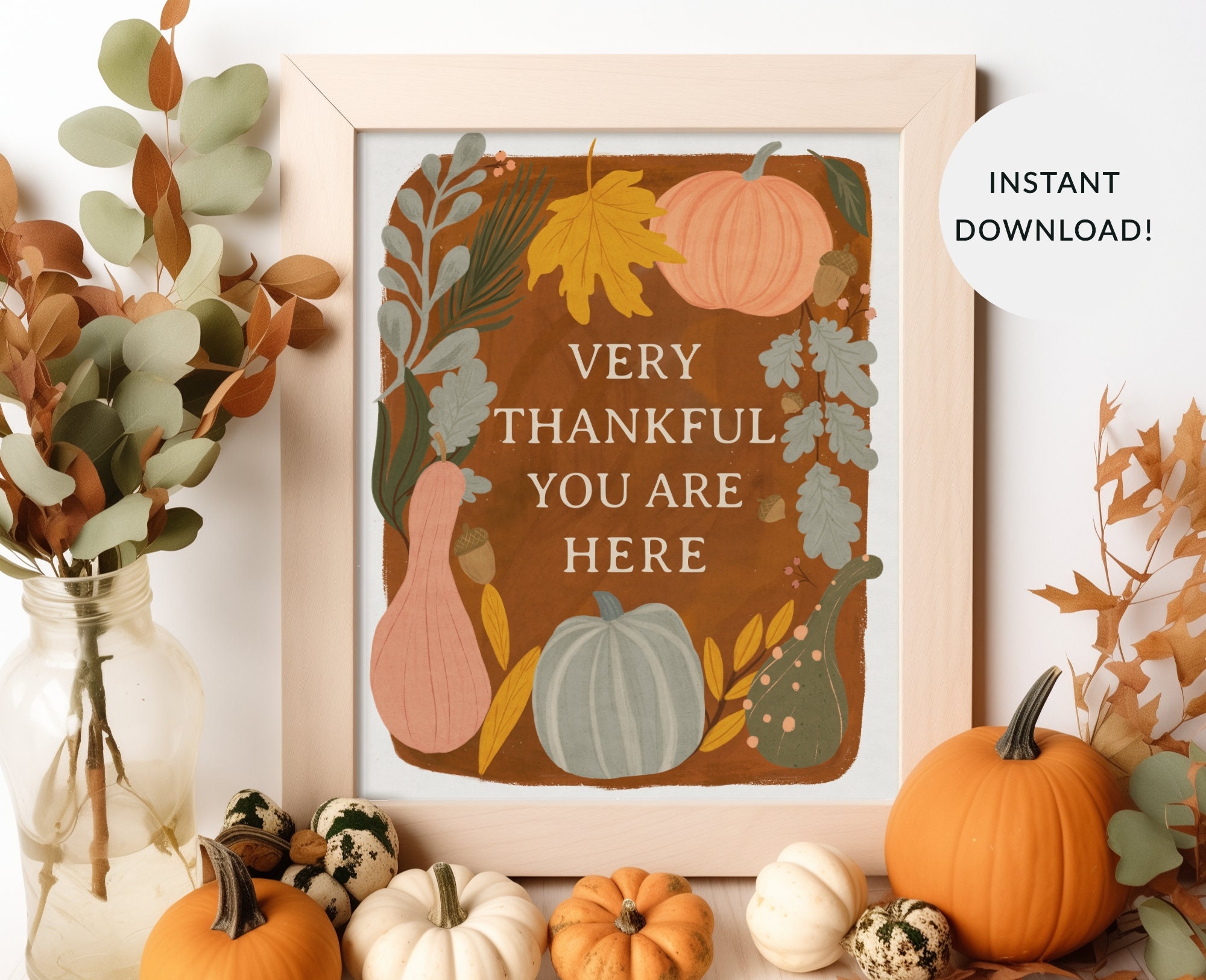 Very Thankful Digital Download Printable Sign 8×10 11×14 16×20 Pumpkins Gourds Fall Happy Thanksgiving Wall Art Boho Art Print