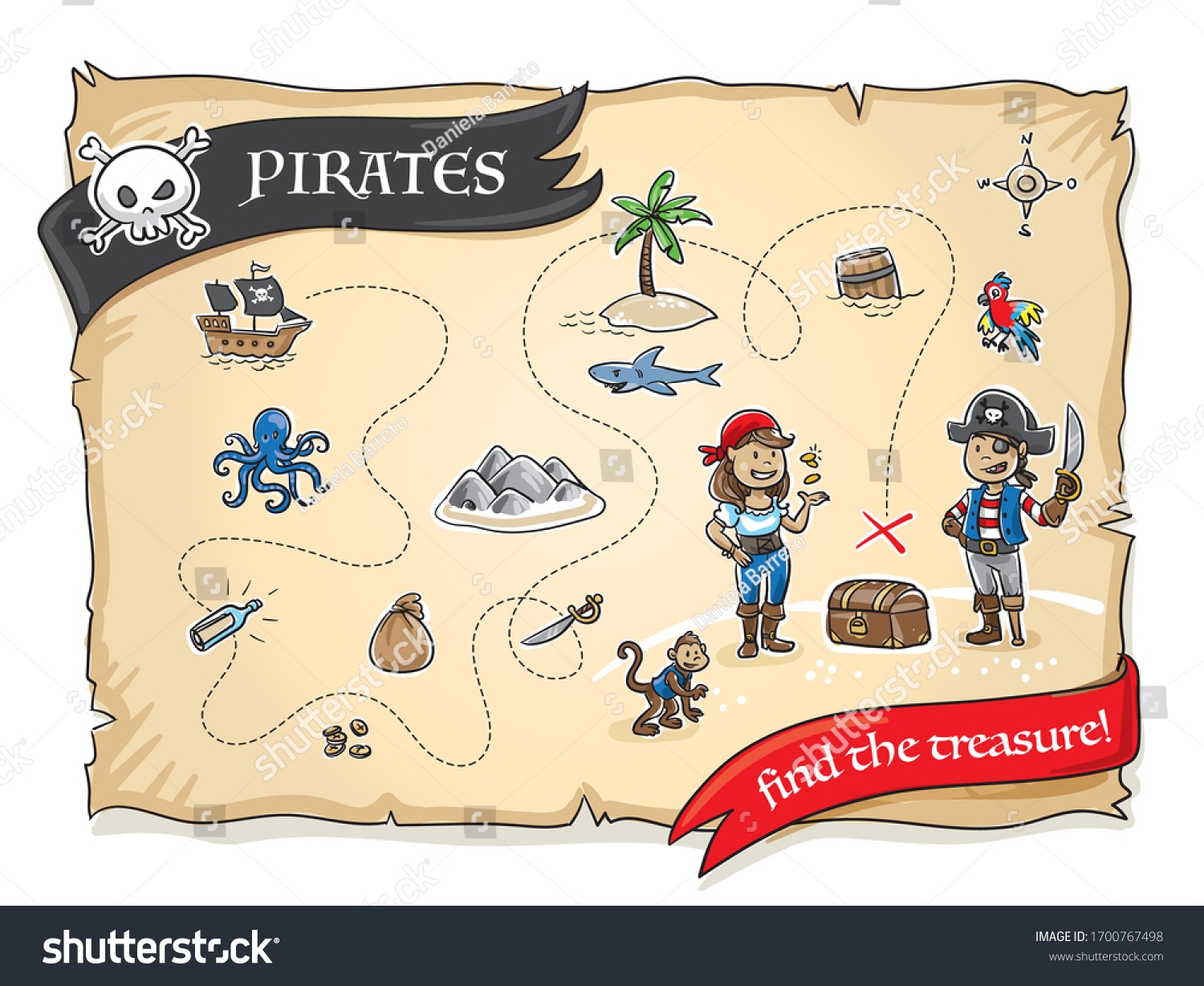 Cute Pirates Treasure Map Lots Icons Stock Vector Royalty Free 1700767498 Shutterstock